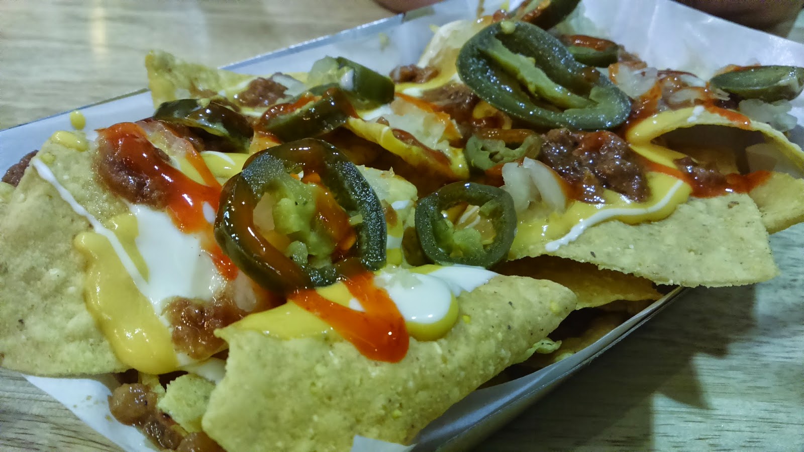 Nachos in homemade chili, jalapeno, cheese sauce, finely chopped onions and sour cream.